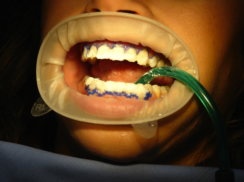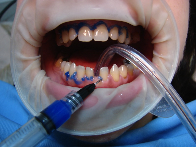Slika 1: Pocetna zastita gingive, pazljivo aplikovan vazelin je barijera za prodor vodonik peroksida u parodontalna tkiva.